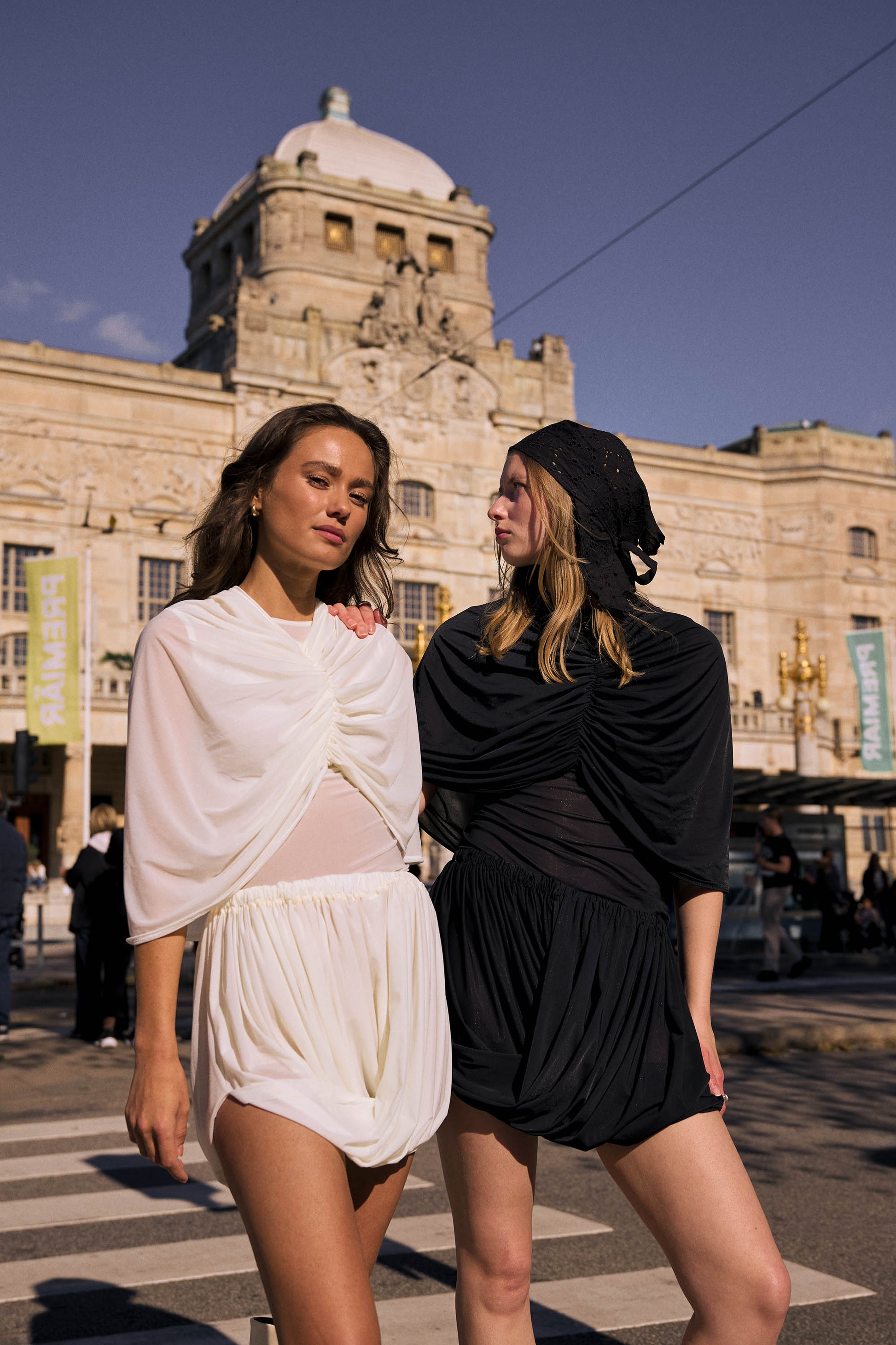 Figure-hugging, sleeveless top made from soft, stretchy material. The "cape" over the shoulders is slightly sheer and not attached to the top (you can tie it so it stays at plays), making it wearable with other garments. You basically get two garments for one.