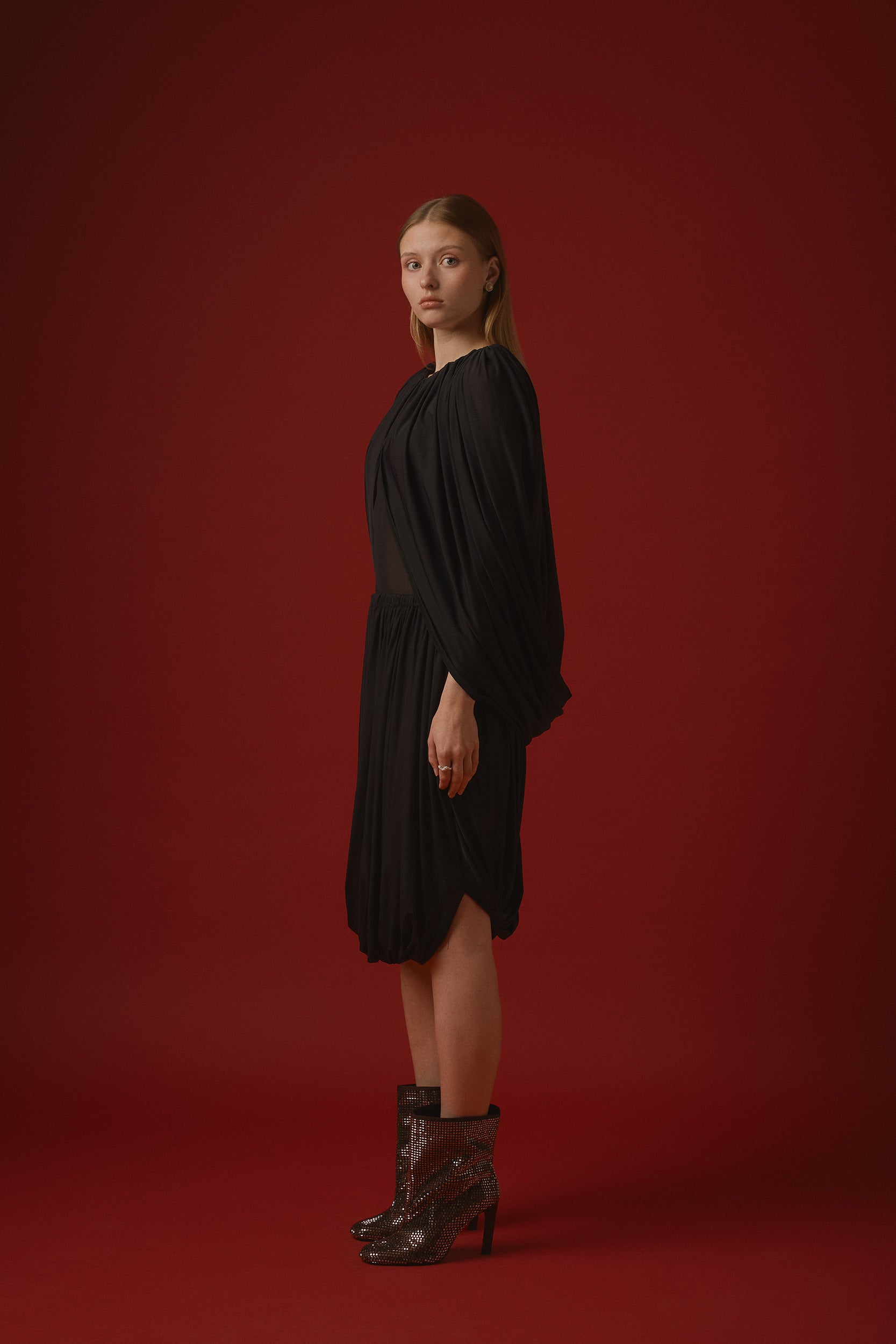 Karla Topp är en ljuvlig, lätt transparent topp i stretchigt, mjukt material. Capen sitter fast i toppen och har ett underbart fall bak, en detalj som gör toppen unik. Capen kan knäppas med en hyska fram, vilket gör tyget mindre transparent vid bysten. Karla Topp passar perfekt till Ava Twisted Skirt.