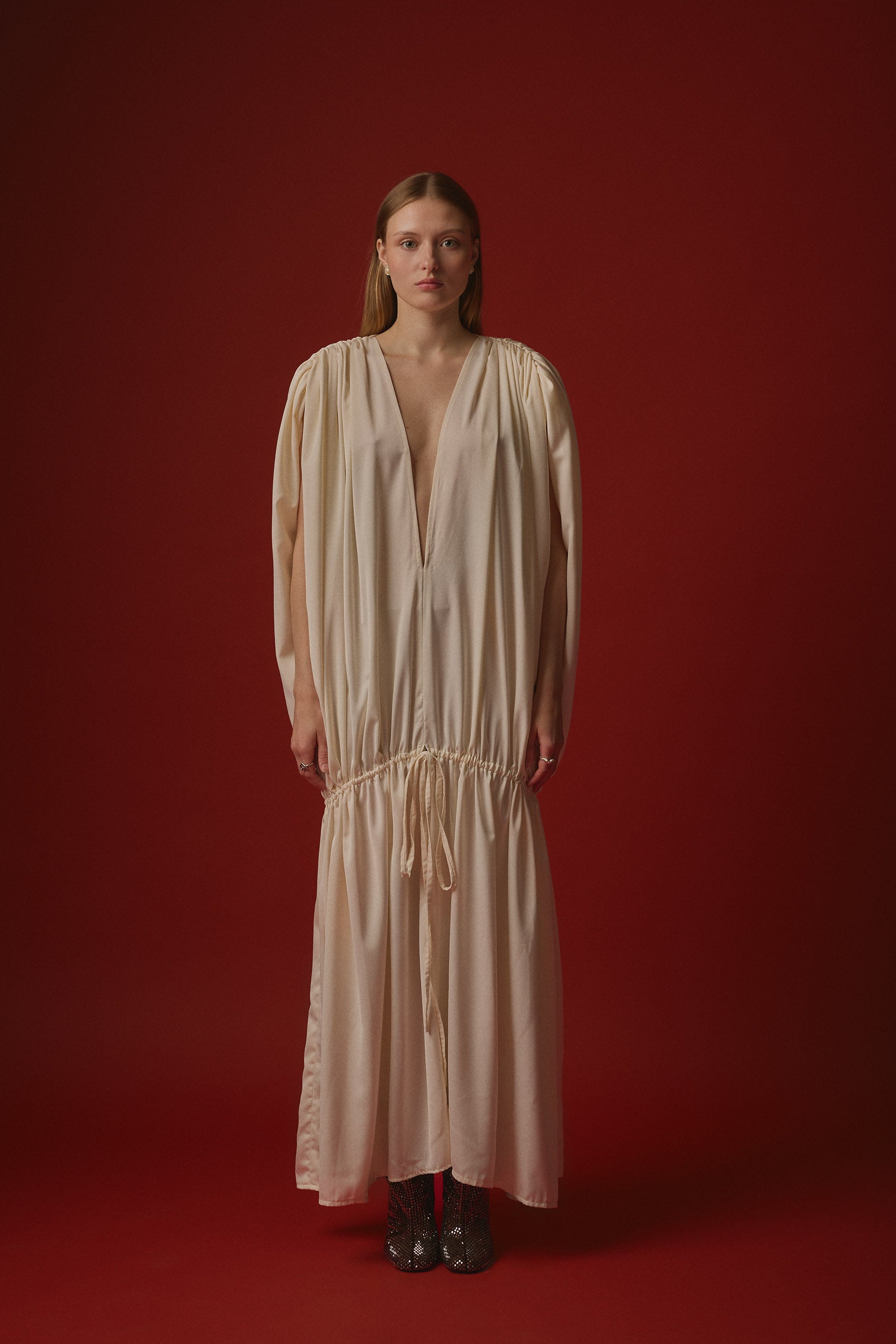 Rynkad axelsöm. Klänningen knyts med band strax nedanför höften.
